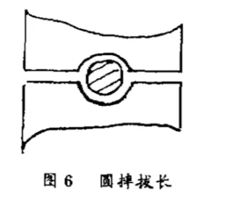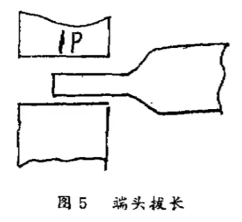(i)開始拔長時,采用兩端頭用較小的送進量、大的壓下量壓成縮口狀(圖5),然后再漸進。這樣又使縱向的拉應(yīng)力增大,減小橫向拉應(yīng)力,從而使中心開裂的剪切應(yīng)力 減小,致使中心開裂的可能性減小。