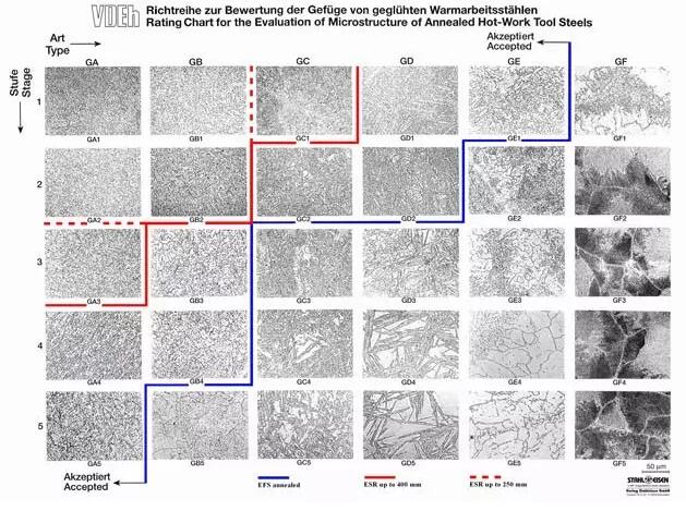 對于H13鋼顯微組織等級的判定依據(jù),國外先進的模具鋼和模具生產廠家以及各研究機構進行了多年的研究和廣泛的實踐,逐漸形成了一些技術標準。如早期的NADCA# 207-90、Chrysler NP-2080、VDG、GM (U.S.,specification DS 9999-1)、JMS (Italy, specifications TT001 and TT022)等,通過金相評級的方法也可以正確評定熱作模具鋼的質量。之后Böhler Edelstahl、Edelstahl Witten-Krefeld及Uddeholm Tooling AB等公司在NADCA# 207-90標準基礎上聯(lián)合研制了新的圖譜,VDEH(德國鋼鐵協(xié)會)則以新的標準號SEP-1614-1996發(fā)布。隨著對壓鑄模失效機理的不斷認識,NADCA(北美壓鑄協(xié)會)對其標準進行了修訂(1997和2003),進一步精簡了90版本中的顯微組織評級圖譜。近年來,這兩個標準普遍得到了世界各國用戶的認可,但對某些評級和測定方法還存在一定的爭議,因此,在需要對退火組織進行細致的評級時,常常仍然沿用NADCA# 207-90標準。另外,即便鋼材通過了橫向V型沖擊的認定,也仍然需要退火組織評級來確定鋼材的最終等級。我國也針對熱作模具鋼的顯微組織制定了相關標準,如熱作模具鋼顯微組織評級(JB/T8420-96)及修訂版本(JB/T8420-08),但該標準未涉及到熱作模具鋼的退火組織評級。