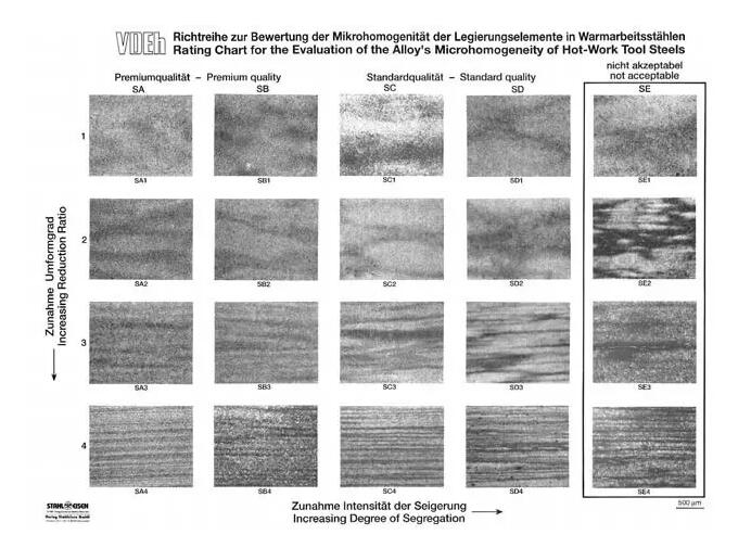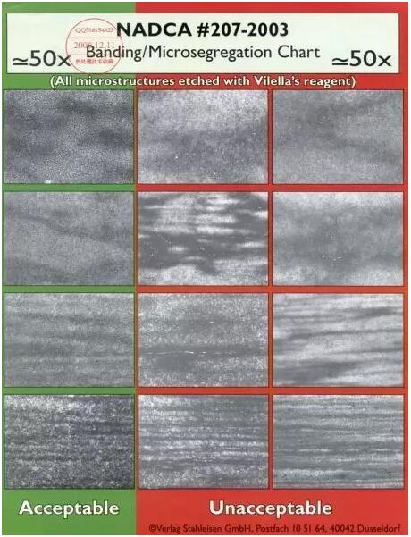 NADCA 207#-2003標準中進行了修訂,劃分依據(jù)是偏析帶中是否存在可見的大顆粒一次碳化物,存在即判為不合格,并且不再區(qū)分不同鋼種的帶狀組織。如下圖: