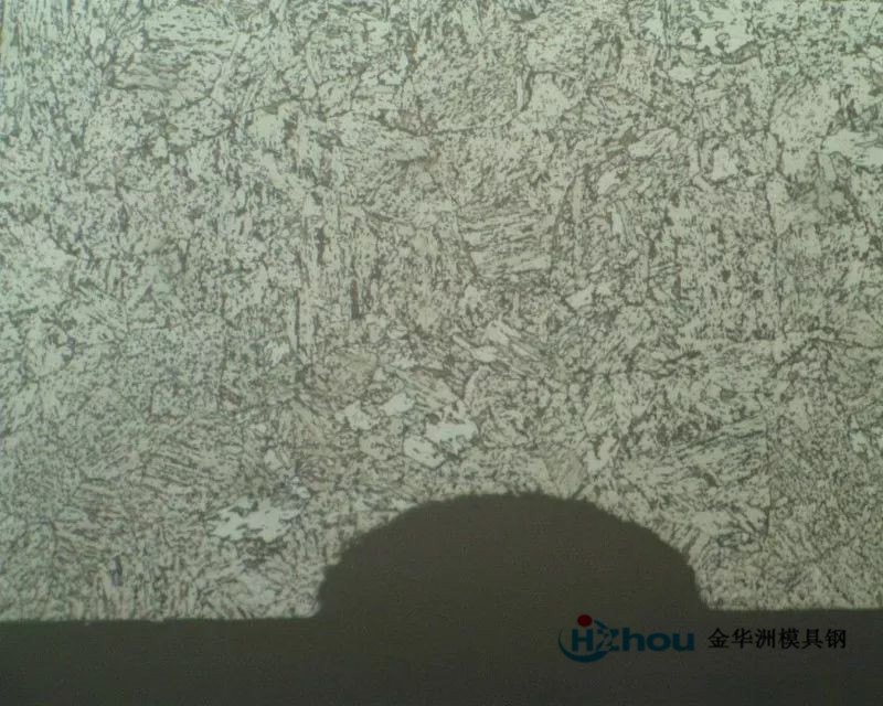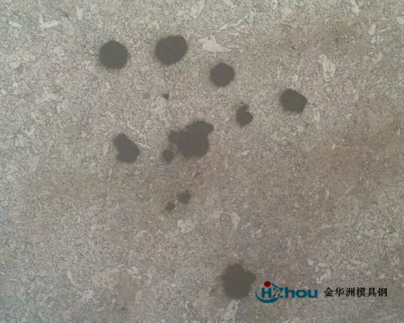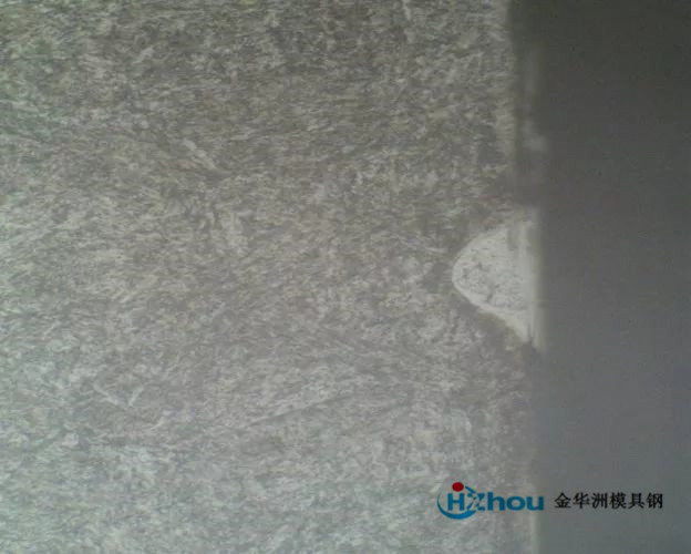 八、模具在拋光時(shí)時(shí)常會(huì)發(fā)現(xiàn)非常小的點(diǎn),因?yàn)辄c(diǎn)非常小,一般需要用高倍的放大鏡觀察,下圖均為100倍照片,左側(cè)孔點(diǎn)較為規(guī)則,以圓形或者接近圓形,孔點(diǎn)邊緣組織與基體組織未見差異,實(shí)為加工過(guò)程中所產(chǎn)生的腐蝕點(diǎn),右側(cè)照片也為圓形,但中間位置明顯可見有灰色夾雜物殘留,實(shí)為夾雜物影響的小點(diǎn),一般高質(zhì)量的材料內(nèi)部夾雜物含量非常少,如果有大面積的點(diǎn)一般都是加工過(guò)程中產(chǎn)生的腐蝕點(diǎn),腐蝕點(diǎn)的分布一般都有區(qū)域性,都在工件表面形成,經(jīng)降面或者粗油石重新打磨可以消除。