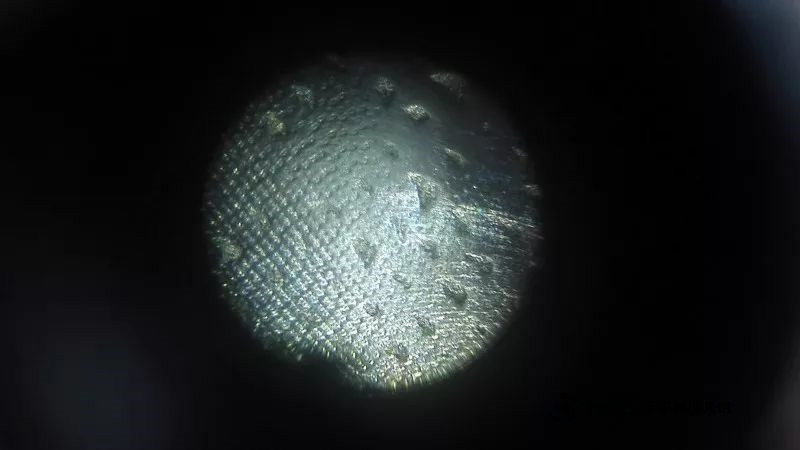 三、工件銑加工完畢后底部較大量點(diǎn)狀缺陷,放大20倍后形貌見下圖所示,可見點(diǎn)大致呈月牙形,排列較為規(guī)則,有明顯的方向性,產(chǎn)生原因?yàn)榧庸r(shí)鐵屑未及時(shí)排除,加工過(guò)程中鐵屑損傷表面所致,建議降在處理。