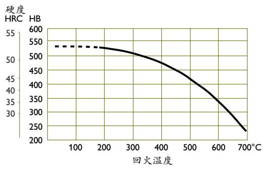 根據(jù)所需硬度,參考回火曲線圖選擇適當(dāng)?shù)幕鼗饻囟??;鼗鹬辽賰纱巍C看位鼗鸷蟊仨毨鋮s至室溫,對小模具可180℃回火,但是推薦250℃為最低回火溫度,每次回火至少保溫兩小時(shí)。