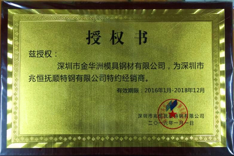 深圳市金華洲模具鋼材有限公司為兆恒撫順特鋼特約經(jīng)銷商